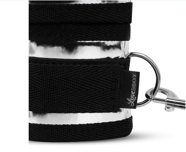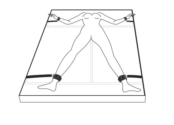 The set includes a shiny silver mask, elegant handcuffs, matching ankle cuffs, and 4 exciting bed restraints that can be placed under the mattress.